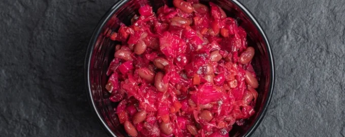Budete potřebovat červenou řepu, zelí, konzervované fazole, mrkev a cibuli.
